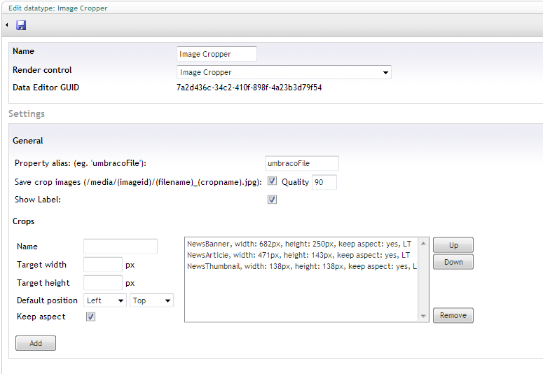 I edited the Image Cropper datatype to the following and gave the Property alias "umbracoFile"