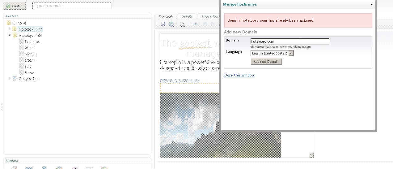 That is the node that I mean. Right click on Hotelopro RO or Hotelopro EN in the tree and select Manage hostnames in the menu. There you can change it.