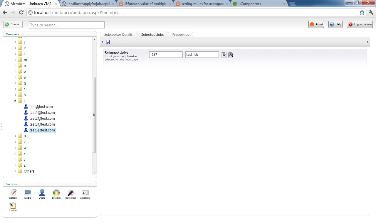 The only thing I needed to solve was how to add a selected job to the uComponents TextString Array data type programmaticaly from a user control. Mr uComponents himself helped me out with this: